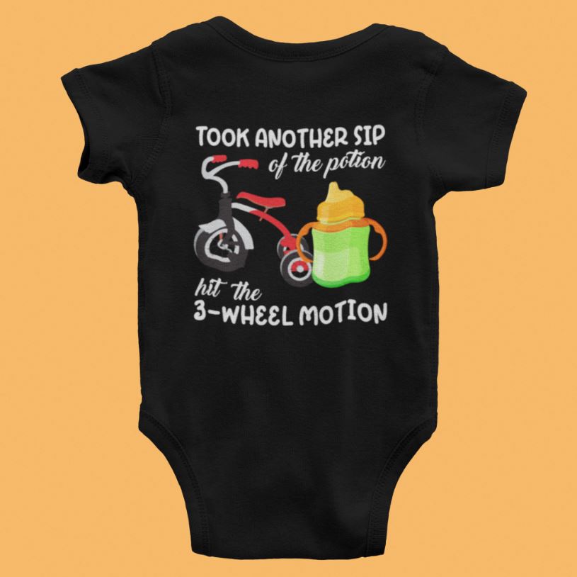All onesies and tops are made with 100% cotton materials. Our full-color designs are made with eco-friendly transferable ink, which is made to last through many washes. Our tops will always include washing and drying instructions with the delivery. ** Custom items such as the Gold chain are made with heat-transfer vinyl. **