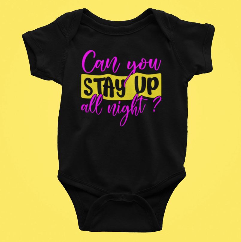 All onesies and tops are made with 100% cotton materials. Our full-color designs are made with eco-friendly transferable ink, which is made to last through many washes. Our tops will always include washing and drying instructions with the delivery. ** Custom items such as the Gold chain are made with heat-transfer vinyl. **